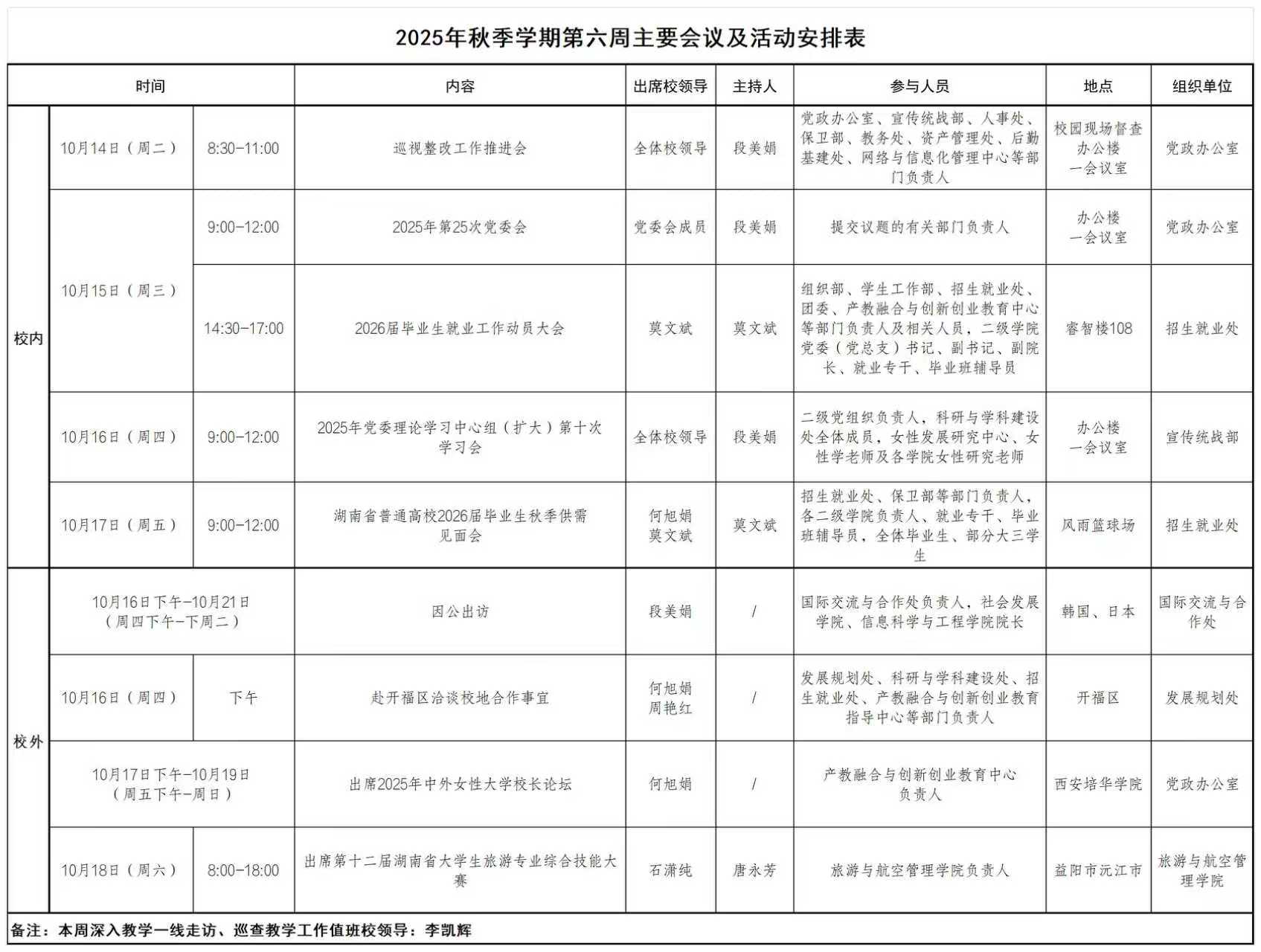 2025年秋季学期第六周主要会议及活动安排