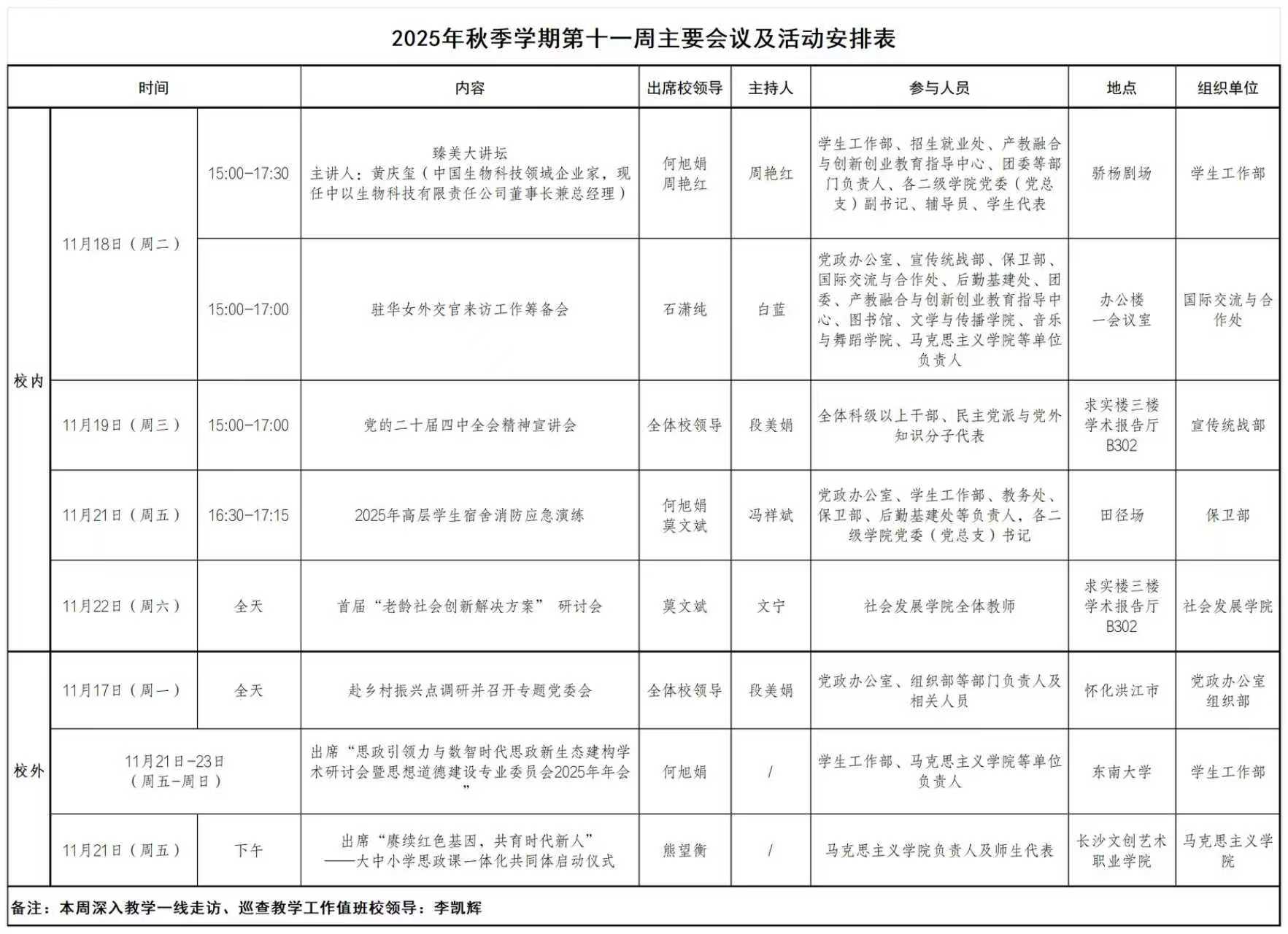 2025年秋季学期第十一周主要会议及活动安排