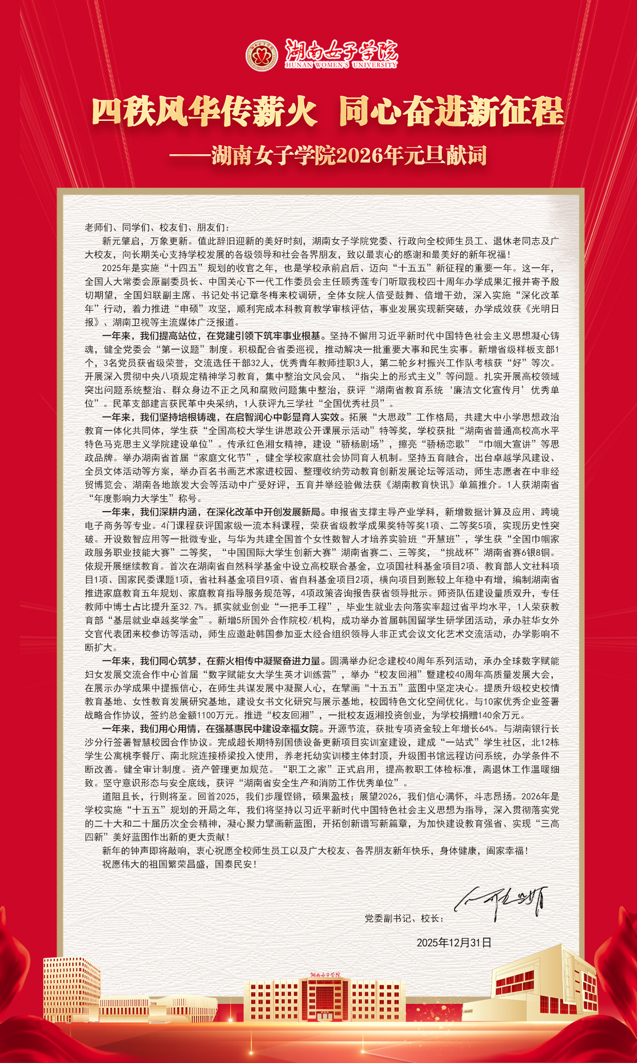四秩风华传薪火 同心奋进启新程——湖南女子学院2026年元旦献词