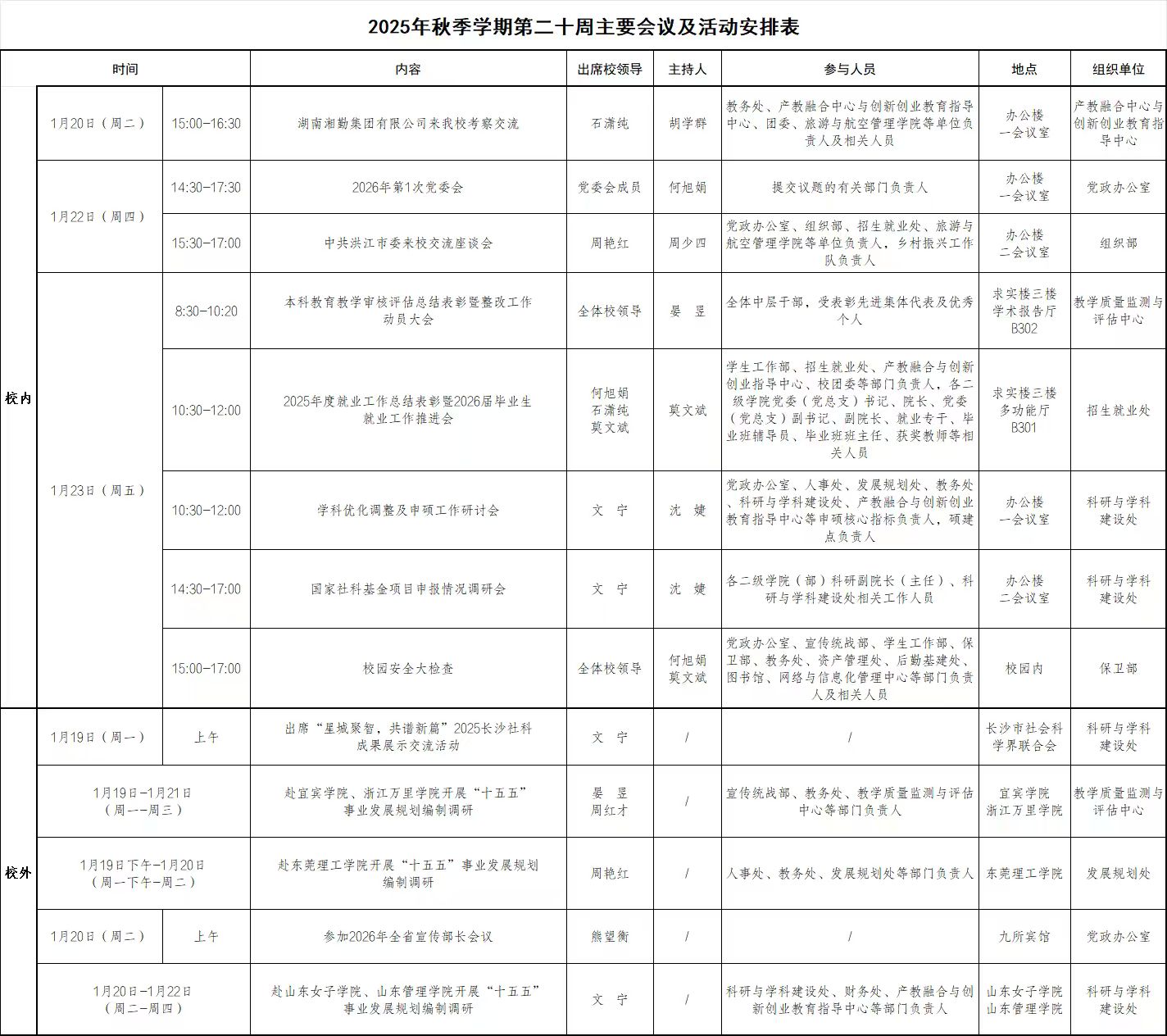 2025年秋季学期第二十周主要会议及活动安排