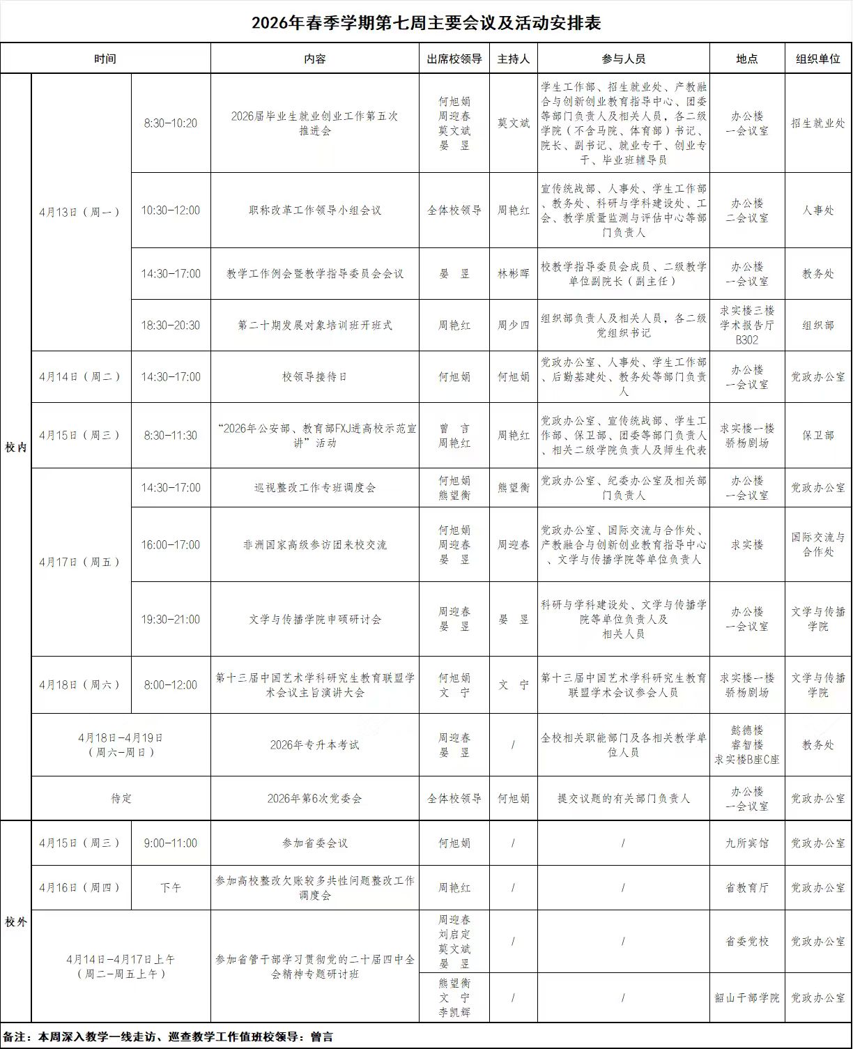 2026年春季学期第七周主要会议及活动安排