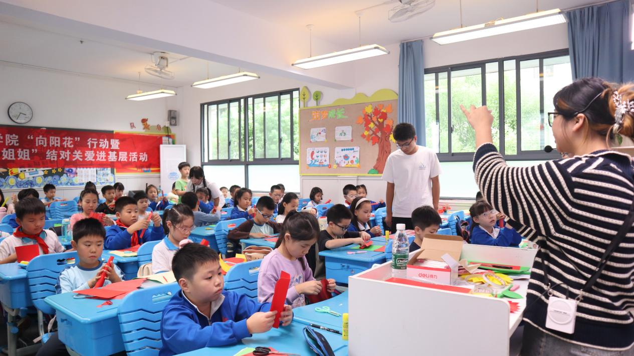 本网讯(社会发展学院 曹旭丹 朱思云)彩纸翻飞,童声清脆,一堂关于爱与国家的双向奔赴,正在枫树山小学的教室里温情上演。2025年9月26日,在中华人民共和国成立76周年之际,湖南女子学院知明力行社会实践团、“爱心妈妈+暖心姐姐”团队用一次特殊的陪伴,在孩子们的心田,播下了一颗名为“爱国”的种子。