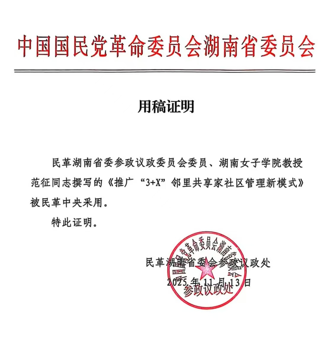 本网讯(民革支部 范征)近日,民革湖南省委参政议政委员会委员、民革省直湖南女子学院支部主委范征教授撰写的社情民意《推广“3+X”邻里共享家社区管理新模式》获民革中央采纳,彰显了社情民意信息作为参政议政“直通车”的重要价值。