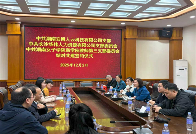 会上,商学院教师第三党支部、湖南安博人云科技有限公司党支部、长沙华伟人力资源有限公司党支部共同签署结对共建协议并举行授牌仪式,标志着校企党建联建迈入实质新阶段。