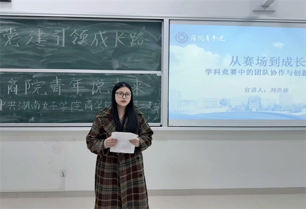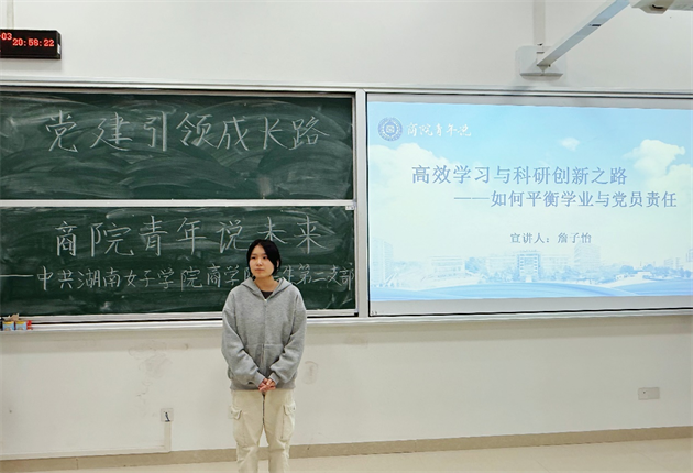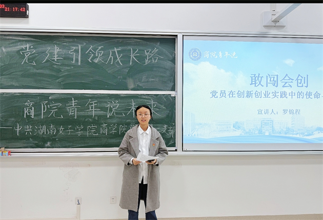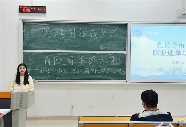 本网讯(商学院 王铁锁)12月3日晚上,湖南女子学院商学院学生第二党支部在求实楼C202教室举办“党建引领成长路,商院青年说未来”主题党日活动。活动创新组织形式,紧扣“党建+专业”融合主线,邀请四位在学业、竞赛、创业、就业等方面表现优异的学生党员担任主讲,通过“身边人讲身边事”的方式,分享将成长思考融入专业实践的切身经验,探索贴近青年、引领成长的组织生活新路径。