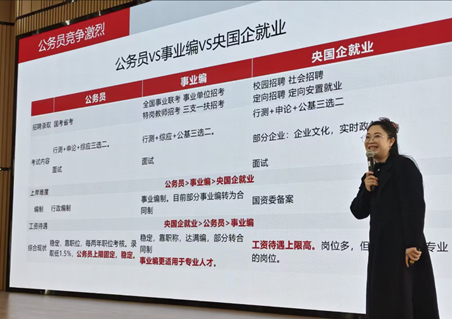 为帮助学生准确把握当前央国企就业形势,有效破除招聘信息壁垒,切实提升应聘竞争力,学院特邀具有丰富行业经验的郭桂芳老师担任主讲嘉宾,开展专题辅导。讲座期间,郭桂芳紧扣学生普遍关注的核心问题,系统阐述了公务员报考与央国企招聘的政策差异、招聘流程及关键节点,重点结合计算机、大数据等专业特点,深入分析了不同类型国企的岗位设置、招聘标准与能力要求。通过典型案例剖析,详细讲解了笔试要点、面试技巧及应答策略,使参训学生对央国企求职有了更加全面深入的认识,为后续备考提供了明确指导。