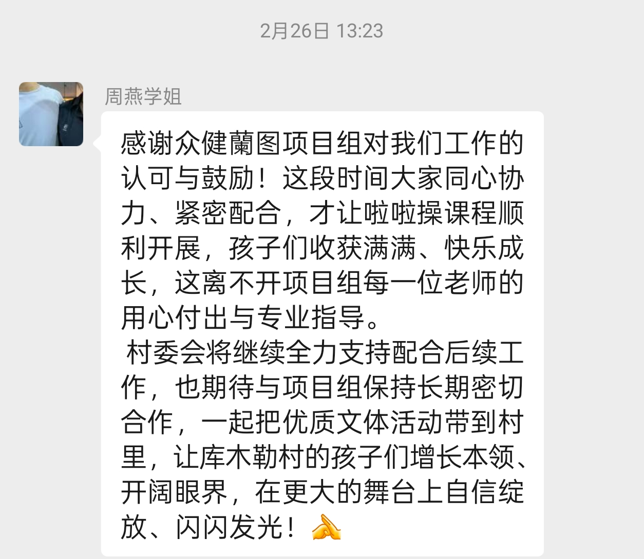 当最后一次课程结束,八位教练员依次通过镜头,为远方的孩子们送上真挚的祝福。“希望你们一直保持对运动的热爱”“你们是最棒的,加油”一句句朴实的话语,承载着跨越山河的牵挂。孩子们挥舞着小手,用稚嫩的声音回应着“谢谢老师”“老师再见”,那一刻,屏幕两端的距离被彻底消融。“众健蘭图”项目组全体成员向库木勒村村支两委致以最诚挚的感谢。对方负责人亦深情回应:“感谢项目组对我们工作的认可与鼓励!这段时间大家同心协力、紧密配合,才让啦啦操课程顺利开展,孩子们收获满满、快乐成长。这份真诚的双向奔赴,正是项目持续推进、合作不断深化的最好注脚。