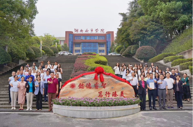 在热烈的掌声中,段美娟与九三学社湖南女子学院支社原主委龚德贵教授共同为校训石揭幕。揭幕后,段美娟向九三学社湖南女子学院支社颁发捐赠证书。校训石摆放在学校东北门入口的阶梯前,长4米2,高1.75米,厚0.3米,花岗岩材质。正面镌刻“懿德睿智 笃行臻美”的校训,背面为“科教之光 润泽千秋”。整体造型优美,厚重大气。从校训石沿阶梯植物景观延伸,与懿德楼楼顶的校名互相辉映,融为一体,成为校园中一道亮丽的文化景观。