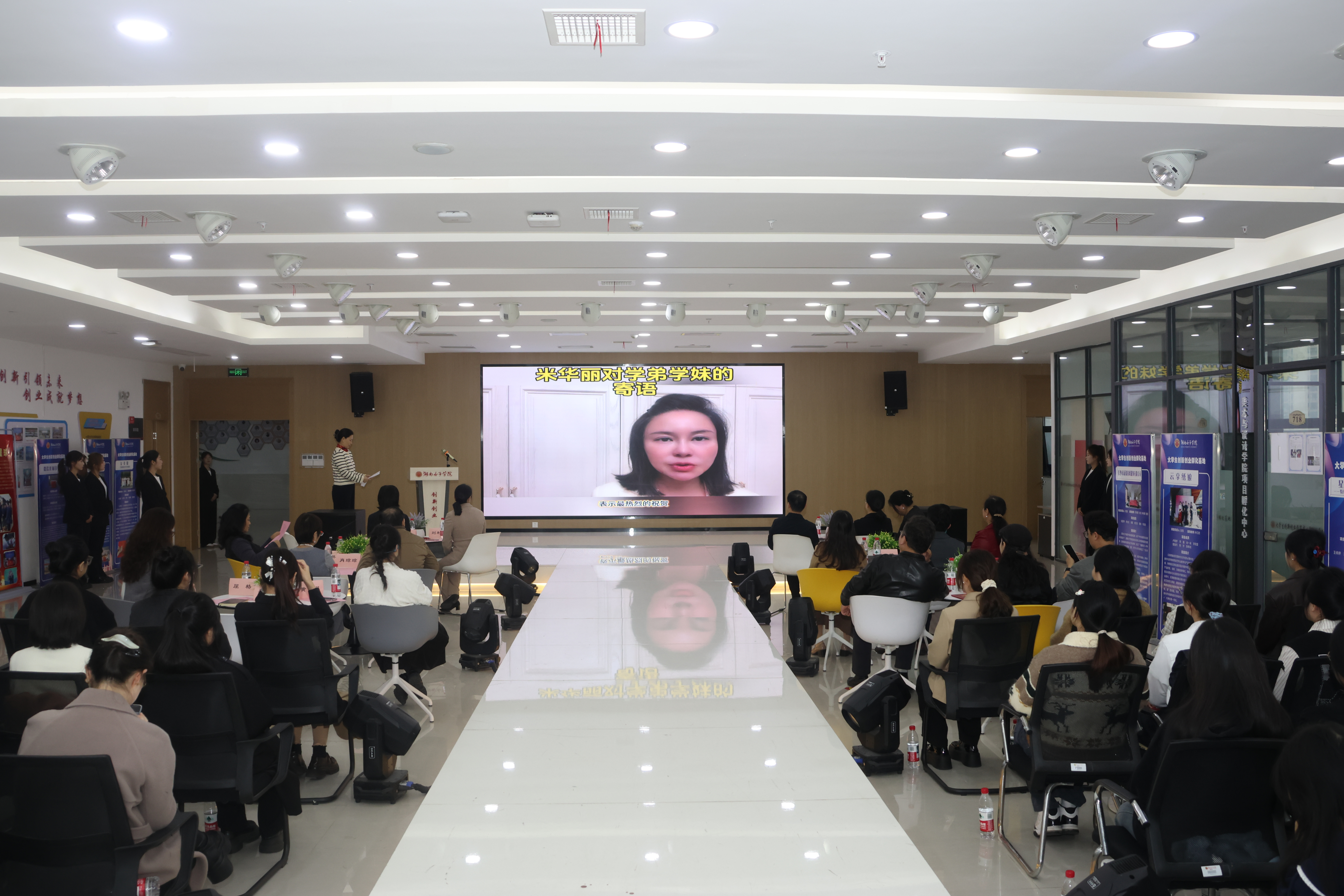 在热烈的掌声中,与会领导莫文斌、刘利华、昌晓英、李伟分别为获奖师生颁奖。奖助学金设立者、校友米华丽女士以视频方式深情寄语,表达对母校和学院培养的感激,鼓励学弟学妹们珍惜校园时光,坚信热爱的力量,勇敢定义属于自己的精彩人生。她表示,设立奖助学金旨在传递温暖与责任,希望为学子们的追梦之路增添一份助力。