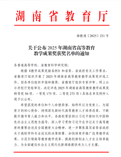 本网讯(教务处 邵尚)近日,湖南省教育厅正式公布第十四届湖南省高等教育教学成果奖评选结果。我校在此次评选中表现突出,6项成果获奖,包括特等奖1项、二等奖5项,获奖总数和等级实现历史性突破,整体获奖率在全省同类院校中位居前列。其中,特等奖为我校首次获得,标志着学校在教育教学改革与成果培育方面迈上新台阶。