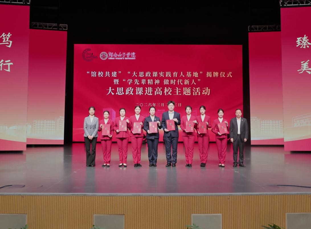 本网讯(学工部 林心童)3月23日下午,“馆校共建”“大思政课实践育人基地”揭牌仪式暨“学先辈精神 做时代新人”大思政课进高校主题活动在湖南女子学院骄杨剧场举行。胡耀邦故里管理局党组成员、副局长曾臻一行,湖南女子学院党委书记何旭娟、党委副书记熊望衡等校领导,相关职能部门负责人、各二级学院师生代表共同参加活动。双方通过馆校协同,共同探索“大思政课”实践育人新路径。