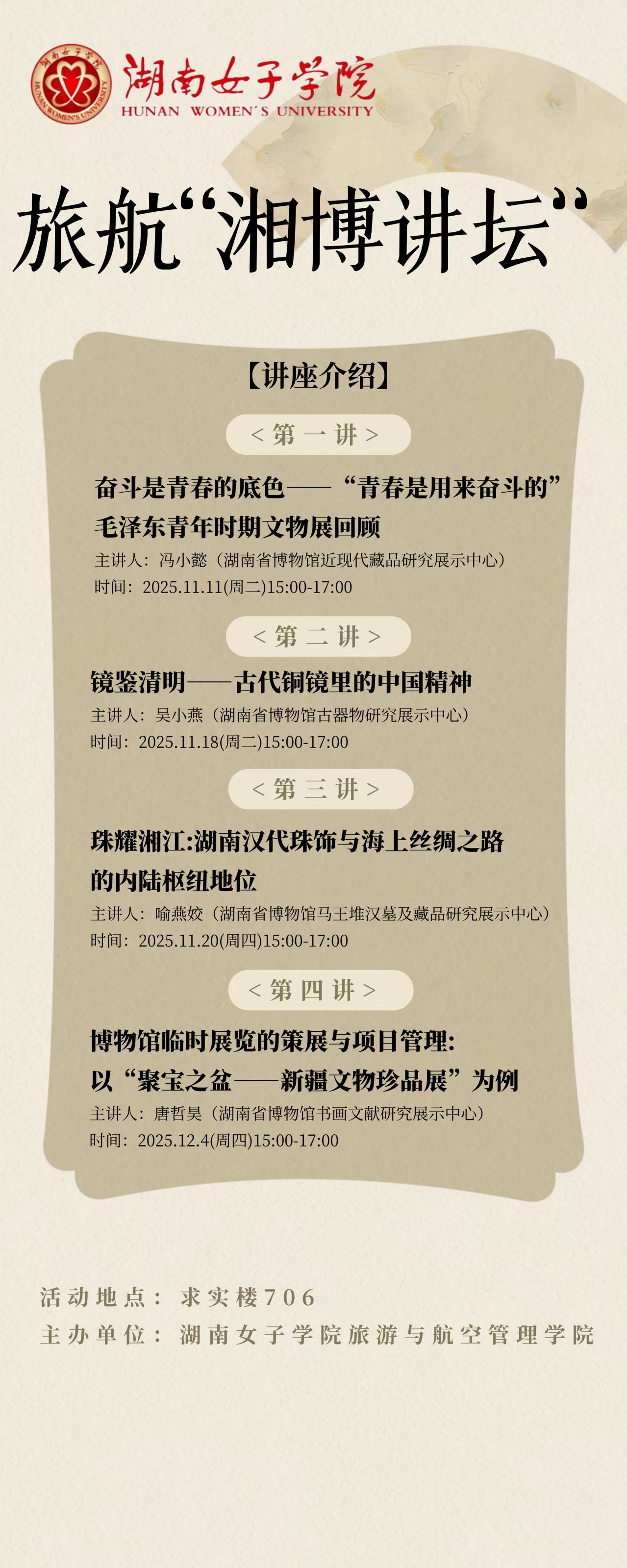 讲座主题:“湘博讲坛”文博思政课 :奋斗是青春的底色——“青春是用来奋斗的”毛泽东青年时期文物展为例 主讲人:冯小懿 主办时间: 2025年11月11日15:00 地点:求实楼706 主办单位: 旅游与航空管理学院 (审核码:tsxsdthcz202510240956)